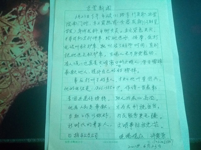 許女士當時在車上,看到李團兵師傅的行為很受感動,在將表揚稿交給車隊時,還不住地夸贊李團兵師傅,同時感謝公司培養出這么優秀的駕駛員。