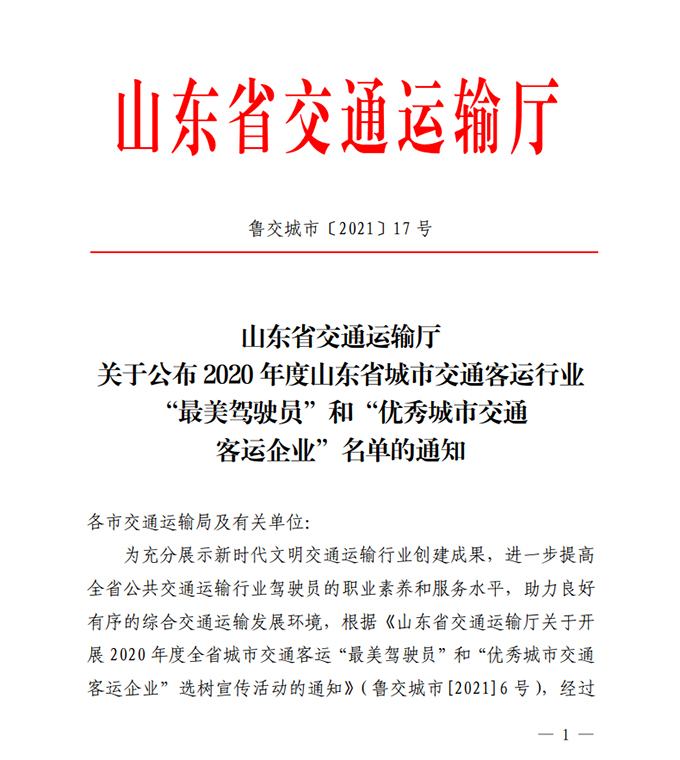 為充分展示新時(shí)代文明交通運(yùn)輸行業(yè)創(chuàng)建成果,進(jìn)一步提高全省公共交通運(yùn)輸行業(yè)駕駛員職業(yè)素養(yǎng)和服務(wù)水平,助力良好有序的綜合交通運(yùn)輸發(fā)展環(huán)境,根據(jù)《山東省交通運(yùn)輸廳關(guān)于開(kāi)展2020年度全省城市交通客運(yùn)“最美駕駛員”和“優(yōu)秀城市交通客運(yùn)企業(yè)”選樹(shù)宣傳活動(dòng)的通知》(魯交城市〔2021〕6號(hào))要求,經(jīng)活動(dòng)啟動(dòng)、材料申報(bào)、資格審查、公開(kāi)公示、人選推薦、專家評(píng)審等環(huán)節(jié),產(chǎn)生了優(yōu)秀城市交通客運(yùn)企業(yè)和城市交通客運(yùn)最美駕駛員名單,市公交公司及兩名駕駛員榜上有名。