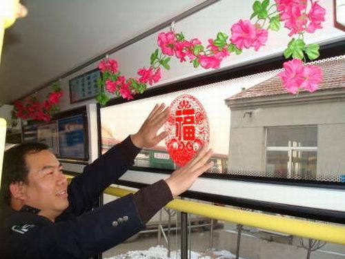 元月11日春運第一天,公交公司8路車組工作人員忙著將自費購買的彩色拉花、剪紙等飾品,張貼、懸掛在車廂內,積極營造出春運溫馨和諧的喜慶氣氛,與乘客一起喜迎春節的到來。