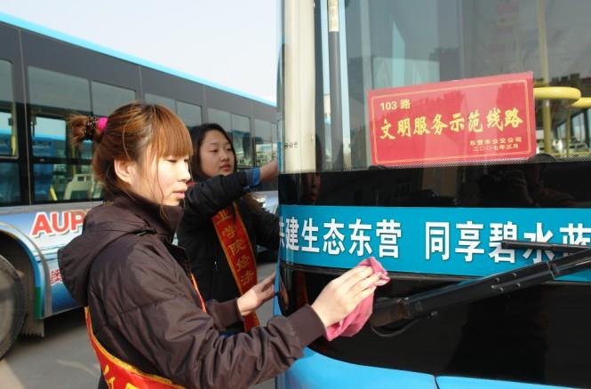 來自東營市職業學院經濟系的大學生和汽車一隊職工共計30余人,分成六個小組,上午幫助駕駛員擦拭車身,打掃車廂,下午乘坐公交車為特需乘客服務。